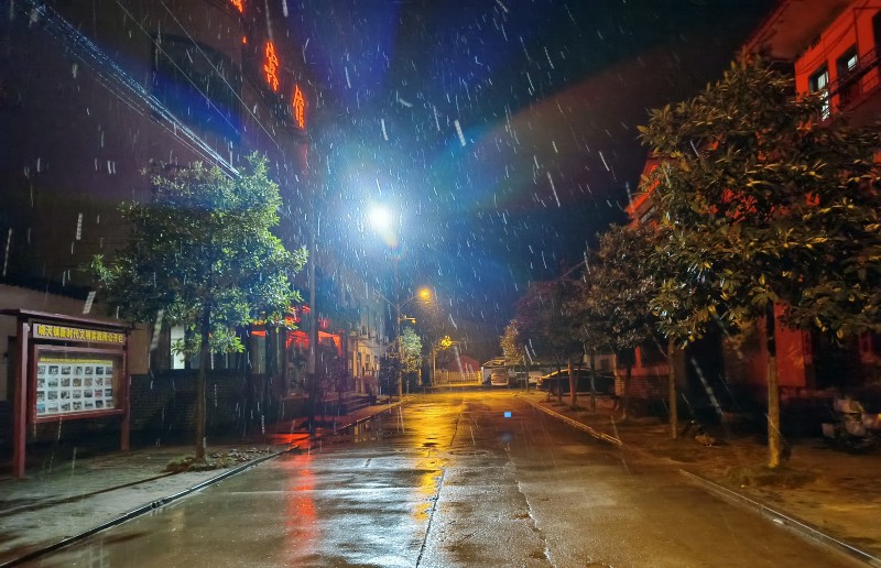 12月16日夜,地處舒城西南山區(qū)的曉天鎮(zhèn)再次降雪,紛紛揚揚的雪花在霓虹和路燈映襯下,五彩斑斕。