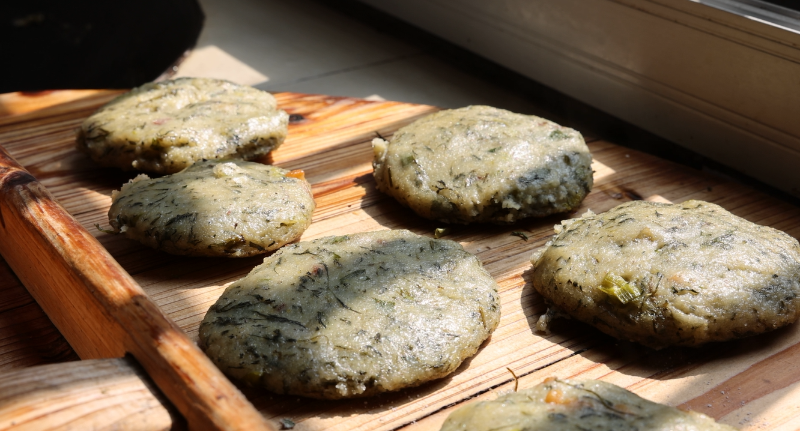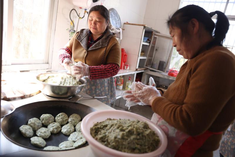 新鮮的蒿子采摘回來后,經(jīng)過清洗與焯水,去除苦澀,保留清香。隨后,將蒿子切碎,與米粉、臘肉丁、食鹽等原料按比例混合均勻,揉成面團(tuán)。面團(tuán)揉好后,村民們便圍在一起,開始制作粑粑。他們熟練地將面團(tuán)搓圓、壓扁,一個個圓潤可愛的蒿子粑粑便呈現(xiàn)在眼前。